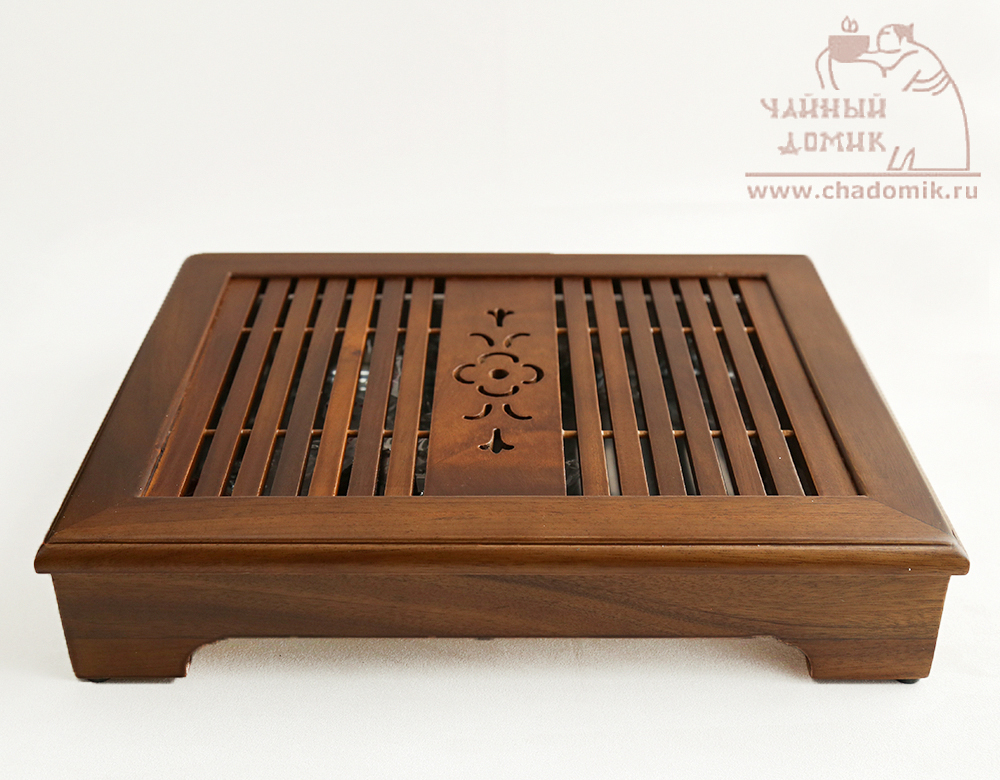 Чайная доска, чабань – это небольшой чайный столик с поддоном. Туда стекает вода и чай, которые будут щедро литься во время церемонии. Форма доски может быть любой: прямоугольной, круглой или более сложных очертаний. Главное состоит в том, что мы можем не думать о том, куда прольётся кипяток, всецело направляя своё внимание на процесс приготовления чая. На уголок чайной доски ставят глиняную статуэтку, что создает нужную атмосферу во время действа.