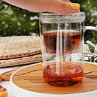 В колбу засыпается чай и заливается кипяток, через 3-5 минут следует нажать на кнопку, расположенную на крышке, и готовый настой стечет вниз, теперь можно пить чай.